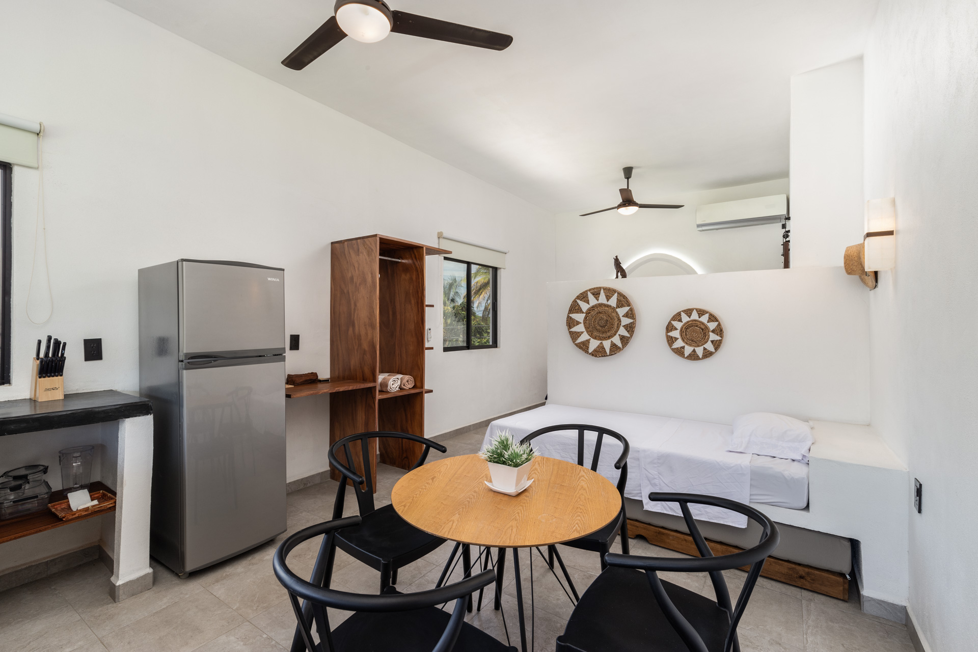 In an up-and-coming neighborhood, just a 10-minute walk from the beach, is the rental designed Cumbre Lofts. There are 4 separate units with balcony views of the lush grass, palm trees and shared pool, all privately fenced in, with high-end furnishings and open kitchen / bar design. All kitchens have giant windows that open up to the fresh air and tropical landscape outside.